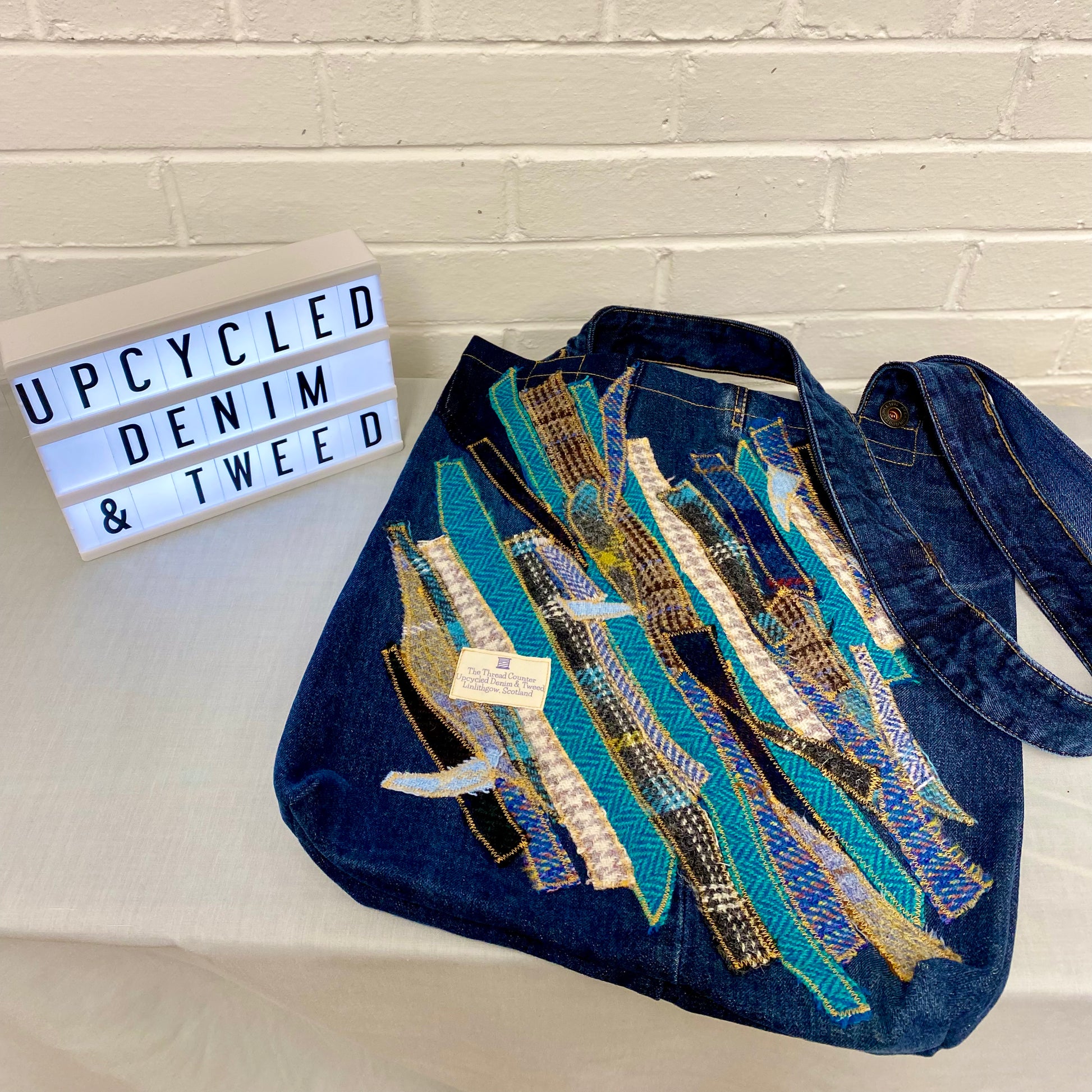 Unique Tote Bag made here in Linlithgow from second hand Denim and Tweed cut offs.